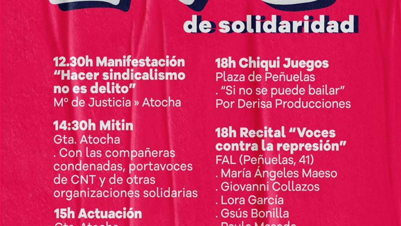 A las 12:30 comienza la manifestación frente al Ministerio de Justicia y a las 14:30 está previsto que las sindicalistas condenadas, portavoces de CNT y de otras organizaciones solidarias intervengan una vez finalizada la manifestación. Miguel Grimaldo, actuará para poner fin a la mañana. Tras la comida organizada para todas las personas afiliadas que acudan a manifestarse, la Fundación de Estudios Libertarios Anselmo Lorenzo abre sus puertas de la calle Peñuelas 41 a las 16:30h para invitar a café y acoger los actos culturales de la tarde. “Chiqui Juegos” a las 18h en la plaza de Peñuelas y a la misma hora, la FAL acoge el festival “Voces contra la Represión” en el que participan María Ángeles Maeso, Giovanni Collazos, Lora García, Gsús BOnilla, Paula Maseda y Rubén Ruiz. La jornada terminará en ese mismo lugar con el espectáculo “No solo duelen los golpes” de la artista Pamela Palenciano.