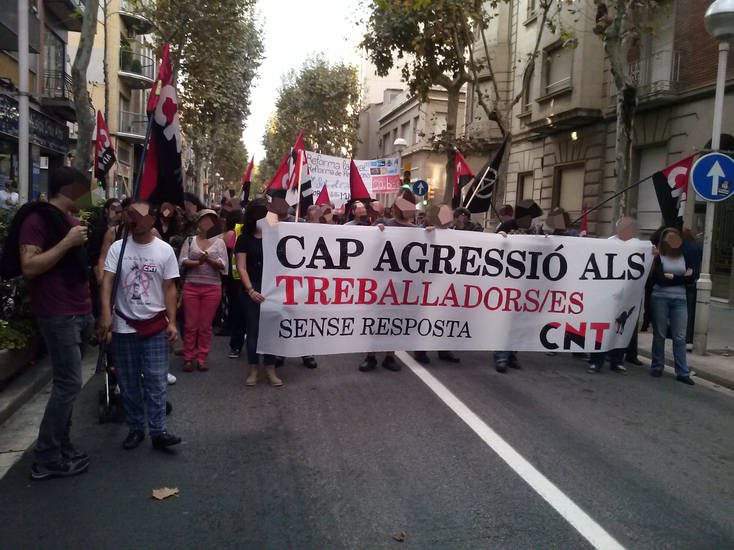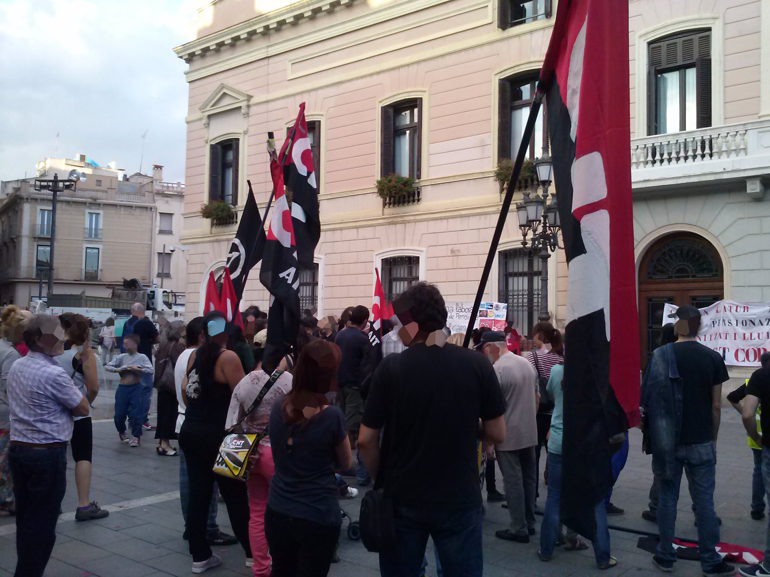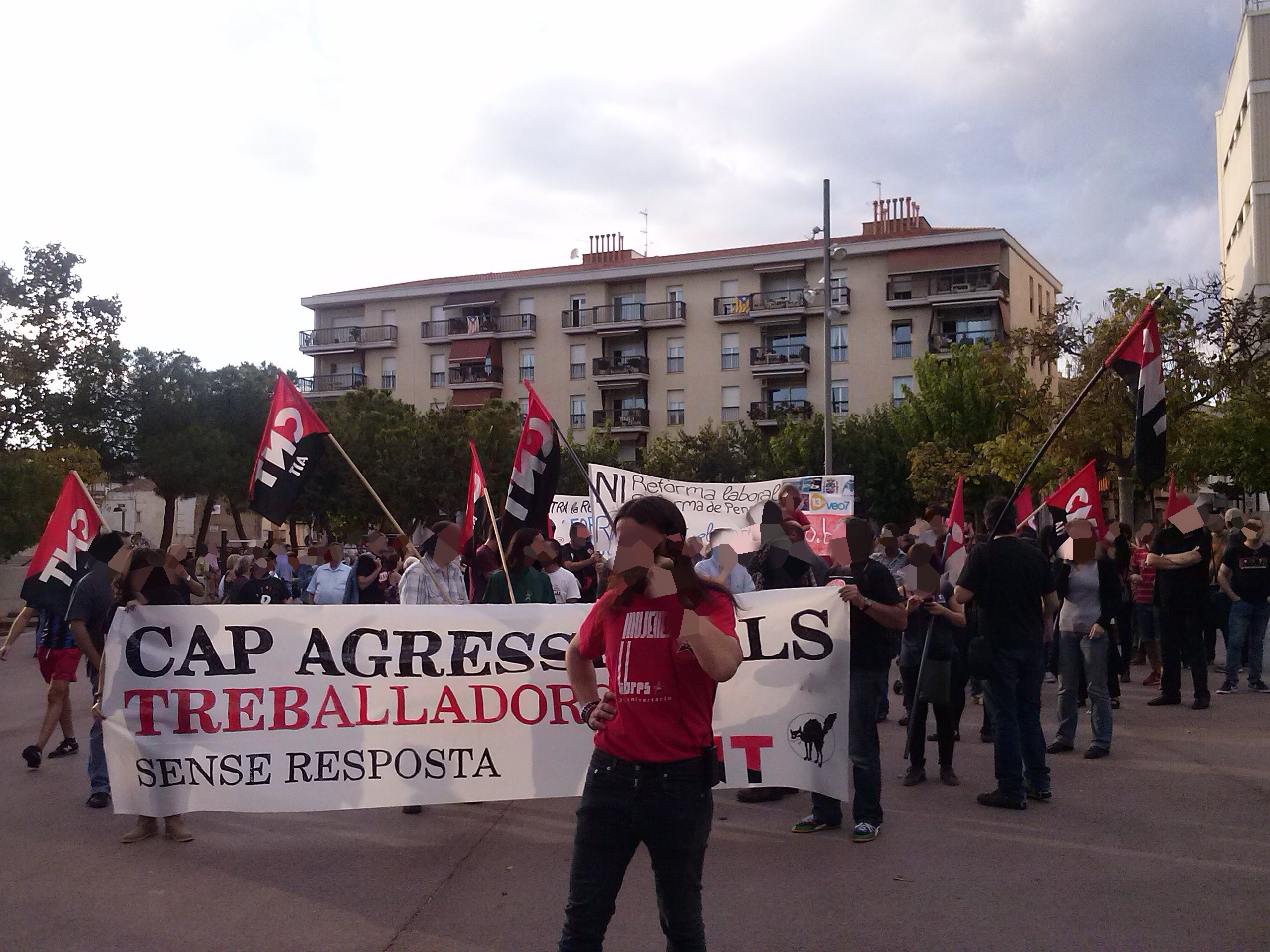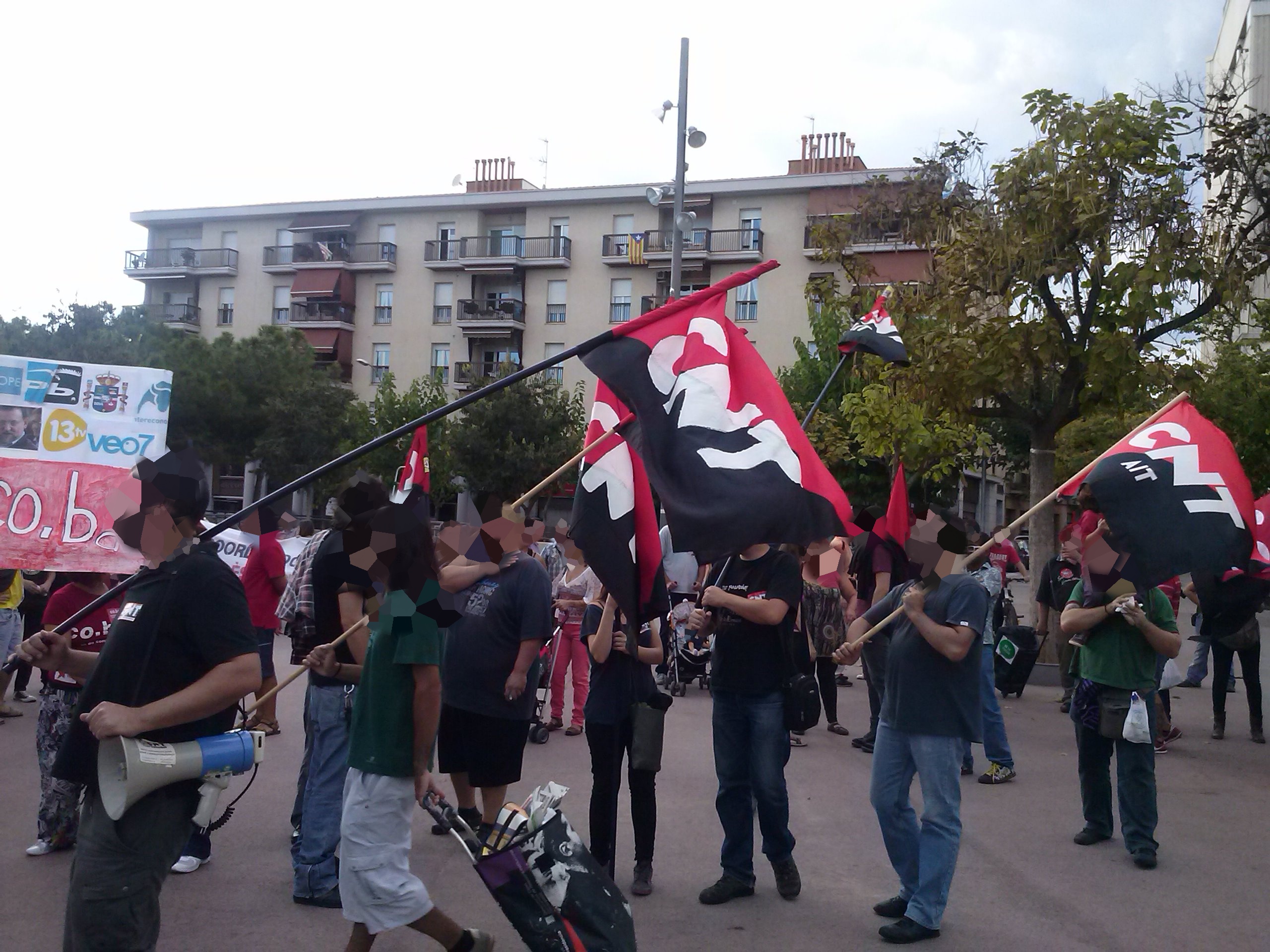 El día 05/10/2013, algunxs de nosotrxs acudimos a la manifestación junto con lxs compañerxs de CNT Sabadell. Contamos también con la asistencia de los yayo-flautas entre otros colectivos. El recorrido transcurrió sin ningún incidente, invitando al resto de ciudadanxs a unirse a la protesta con nuestras voces, repartiendo pegatinas... Nos llamó mucho la atención una de las familias a las que se les entregó pegatinas, se las pegaron en el pecho y nos acompañaron. Una vez llegamos al ayuntamiento se abrió turno de palabra a micro abierto. A destacar las palabras de una mujer del colectivo de los yayos-flautas que nos emocionó con su coraje y sus ganas de luchar....