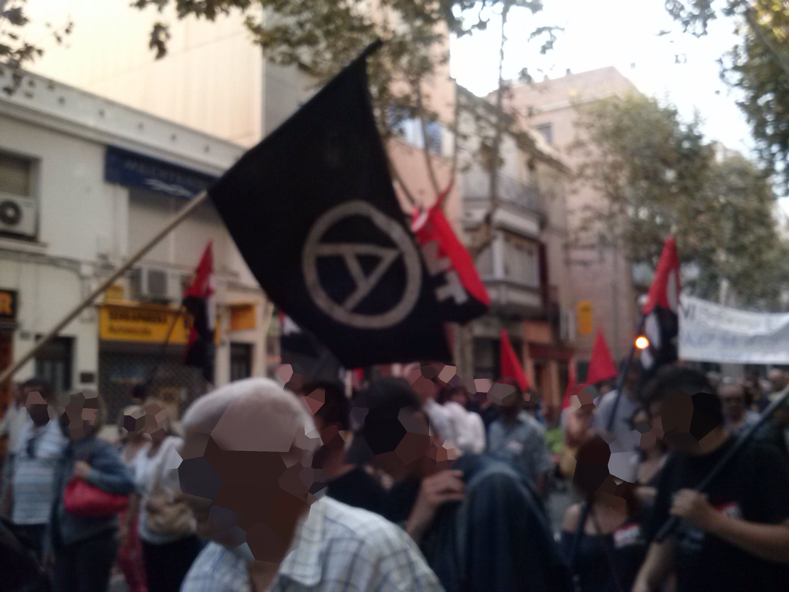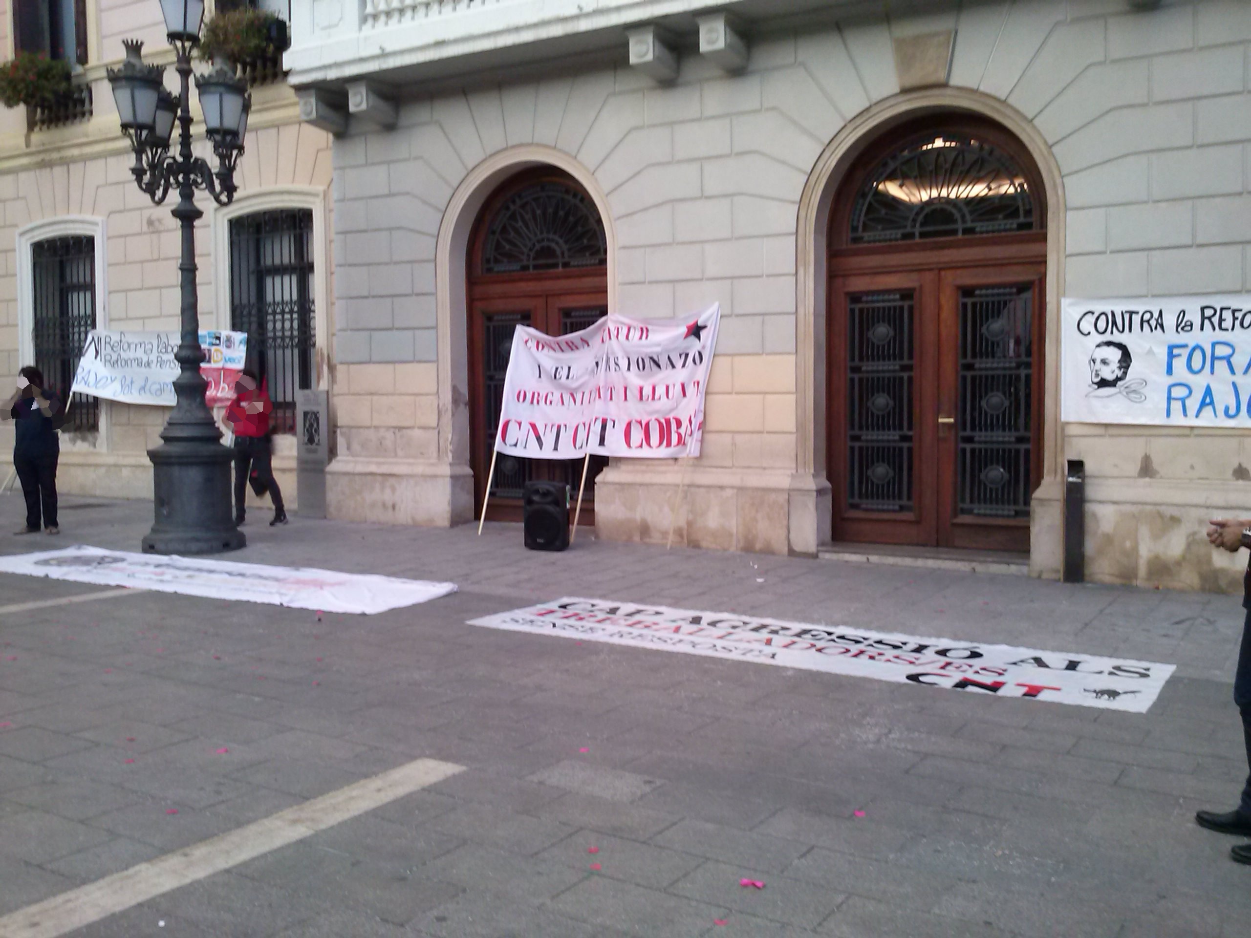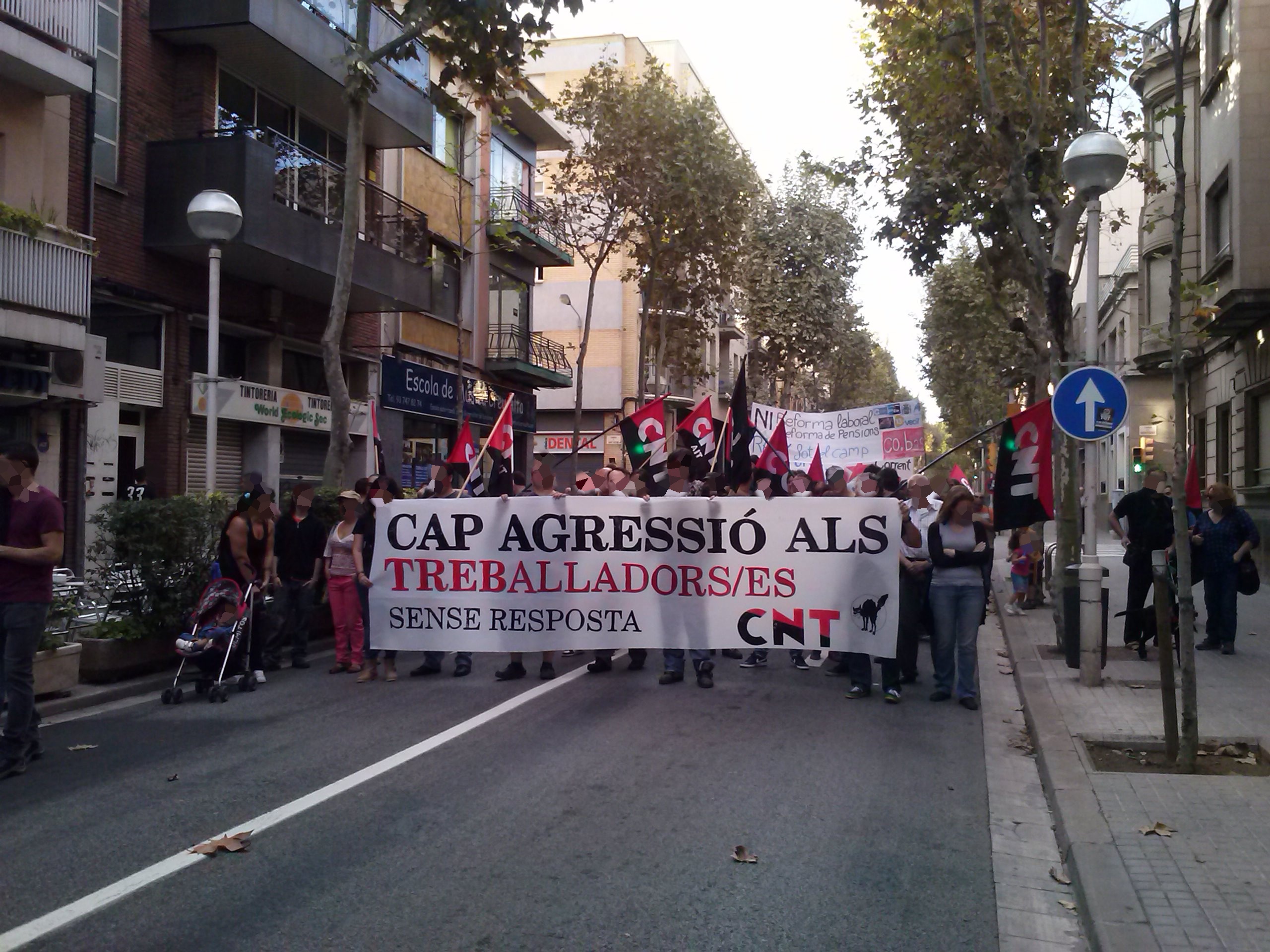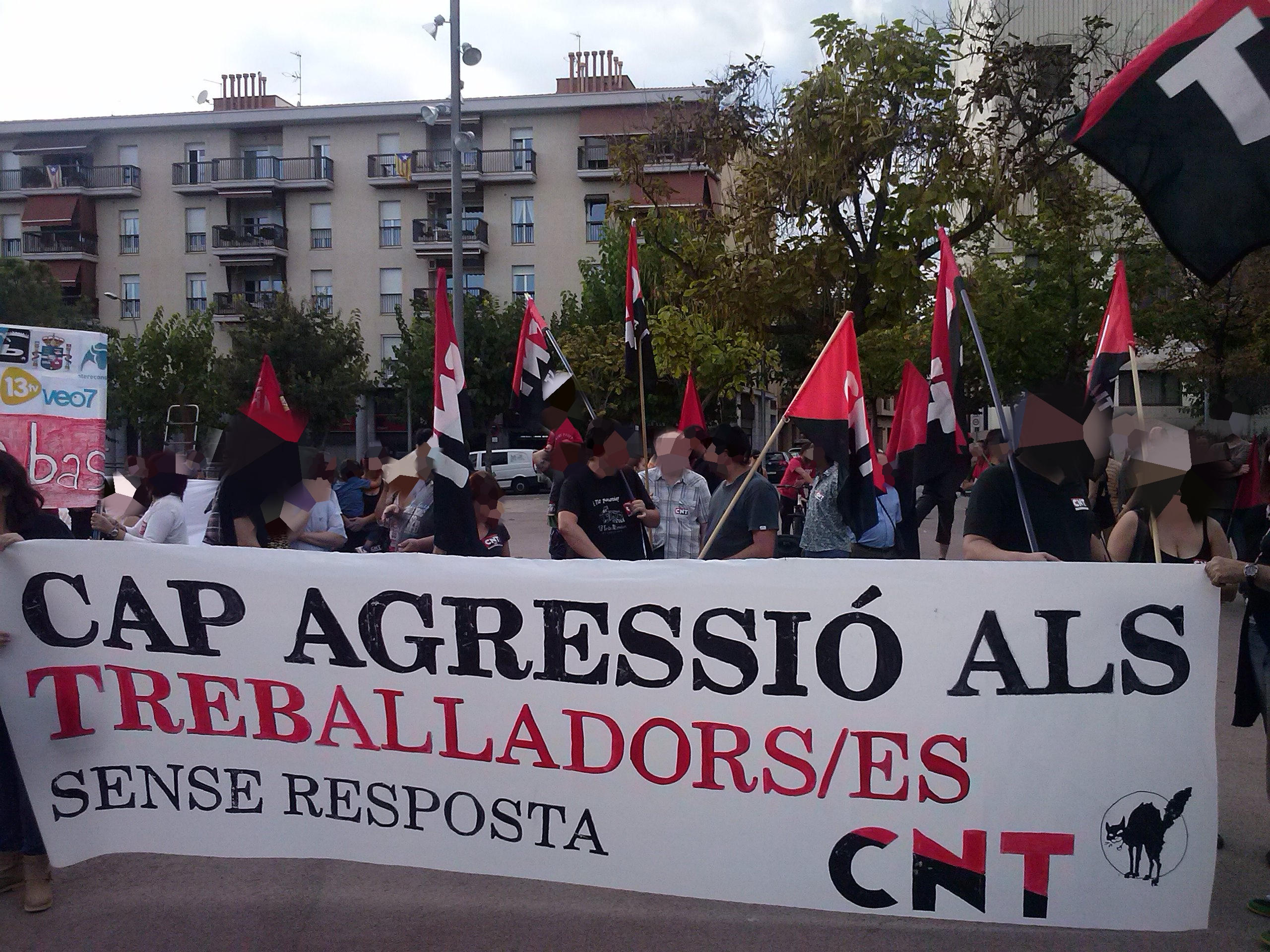 El día 05/10/2013, algunxs de nosotrxs acudimos a la manifestación junto con lxs compañerxs de CNT Sabadell. Contamos también con la asistencia de los yayo-flautas entre otros colectivos. El recorrido transcurrió sin ningún incidente, invitando al resto de ciudadanxs a unirse a la protesta con nuestras voces, repartiendo pegatinas... Nos llamó mucho la atención una de las familias a las que se les entregó pegatinas, se las pegaron en el pecho y nos acompañaron. Una vez llegamos al ayuntamiento se abrió turno de palabra a micro abierto. A destacar las palabras de una mujer del colectivo de los yayos-flautas que nos emocionó con su coraje y sus ganas de luchar....