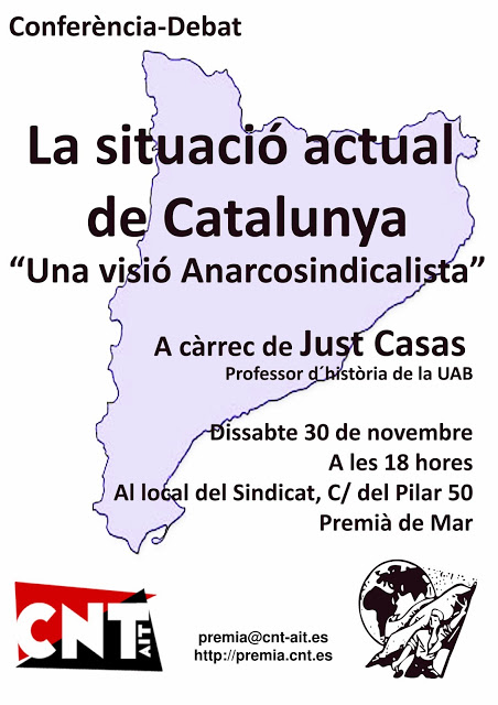 El companys del Sindicat Únic CNT-AIT de Activitats Diverses i Oficis Varis de Premià han preparat per aquest dissabte 30 de novembre una conferència que tractarà la situació actual de Catalunya, la independència, la questió nacional i el dret a la autodeterminació a càrrec del nostre company del Sindicat Únic d'Oficis Varis de Terrassa Just Casas.